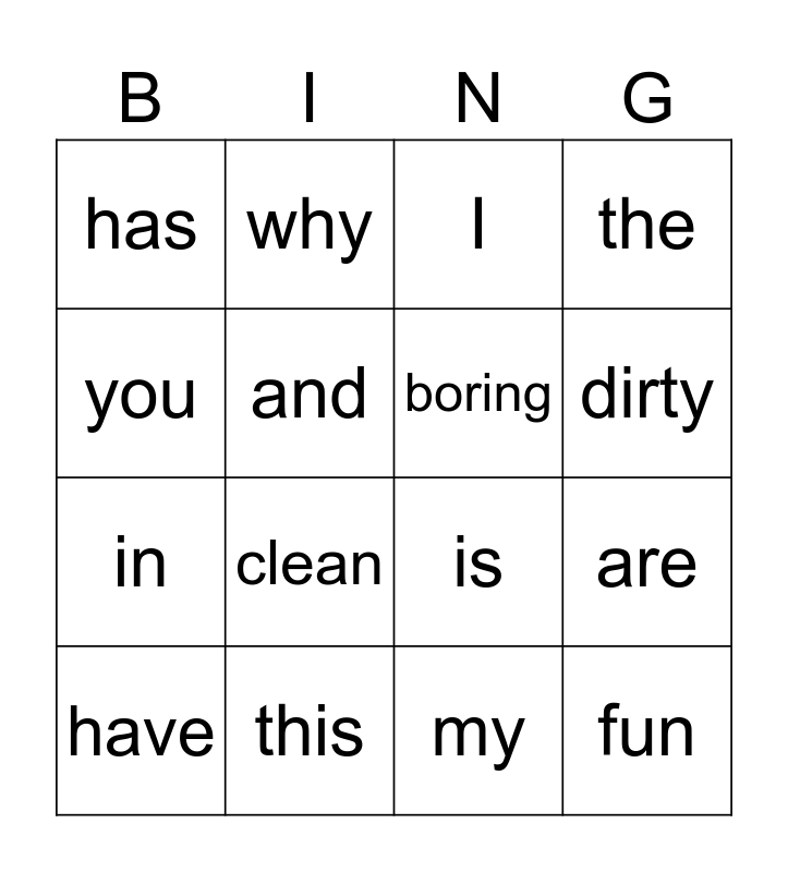 This bingo card has 16 words: this, are, I, has, in, why, is, my, you, and, have, the, clean, dirty, boring and fun.
