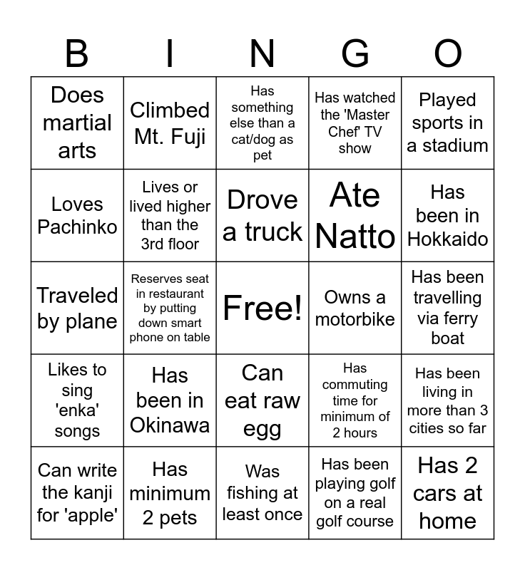 This bingo card has a free space and 24 words: Has been in Okinawa, Has minimum 2 pets, Drove a truck, Can write the kanji for 'apple', Played sports in a stadium, Does martial arts, Loves Pachinko, Climbed Mt. Fuji, Owns a motorbike, Can eat raw egg, Ate Natto, Traveled by plane, Has commuting time for minimum of 2 hours, Has been living in more than 3 cities so far, Lives or lived higher than the 3rd floor, Has been playing golf on a real golf course, Has been travelling via ferry boat, Has something else than a cat/dog as pet, Has been in Hokkaido, Reserves seat in restaurant by putting down smart phone on table, Has 2 cars at home, Likes to sing 'enka' songs, Has watched the 'Master Chef' TV show and Was fishing at least once.