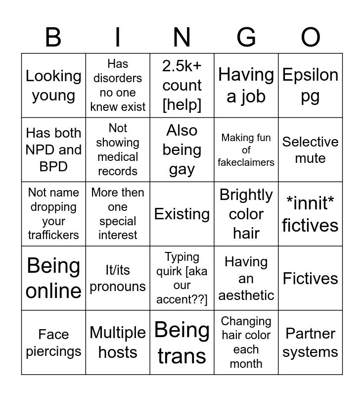 This bingo card has a free space and 24 words: It/its pronouns, Multiple hosts, Also being gay, Face piercings, Epsilon pg, Looking young, Has both NPD and BPD, Has disorders no one knew exist, Brightly color hair, Typing quirk [aka our accent??], Making fun of fakeclaimers, Not name dropping your traffickers, Having an aesthetic, Fictives, Not showing medical records, Changing hair color each month, *innit* fictives, 2.5k+ count [help], Selective mute, More then one special interest, Partner systems, Being online, Having a job and Being trans.