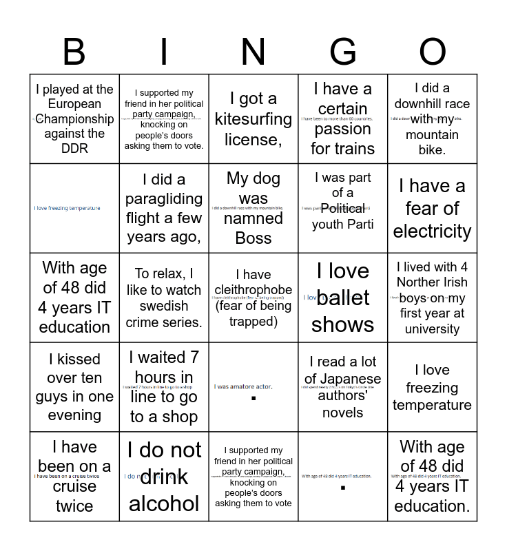 This bingo card has 28 images and 31 words: I drank beer out of a ice hockey championship trophy with the team just winning it, I have been to more than 60 countries., I dream about buying a house in Algarve, Portugal, I did a paragliding flight a few years ago,, I read a lot of Japanese authors' novels, I kissed over ten guys in one evening, My dog was namned Boss, I like "Anime", I did a downhill race with my mountain bike., I am afraid to swim in open water., To relax, I like to watch swedish crime series., I have a certain passion for trains, I was an amatore actor, I love ballet shows, I have a fear of electricity, I played at the European Championship against the DDR, With age of 48 did 4 years IT education., I waited 7 hours in line to go to a shop, I have cleithrophobe (fear of being trapped), I got a kitesurfing license,, I lived with 4 Norther Irish boys on my first year at university, I love freezing temperature, I do not drink alcohol, I have been on a cruise twice, I supported my friend in her political party campaign, knocking on people’s doors asking them to vote, I supported my friend in her political party campaign, knocking on people’s doors asking them to vote., With age of 48 did 4 years IT education, I have cleithrophobe (fear of being trapped), I was part of a Political youth Parti, . and ..
