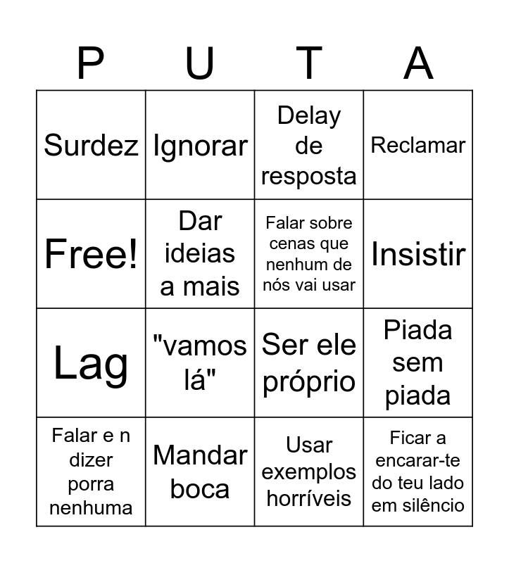 This bingo card has 16 words: Mandar boca, Piada sem piada, Delay de resposta, Surdez, Lag, Ignorar, Ser ele próprio, Usar exemplos horríveis, Free!, Dar ideias a mais, Falar e n dizer porra nenhuma, Reclamar, "vamos lá", Insistir, Falar sobre cenas que nenhum de nós vai usar and Ficar a encarar-te do teu lado em silêncio.