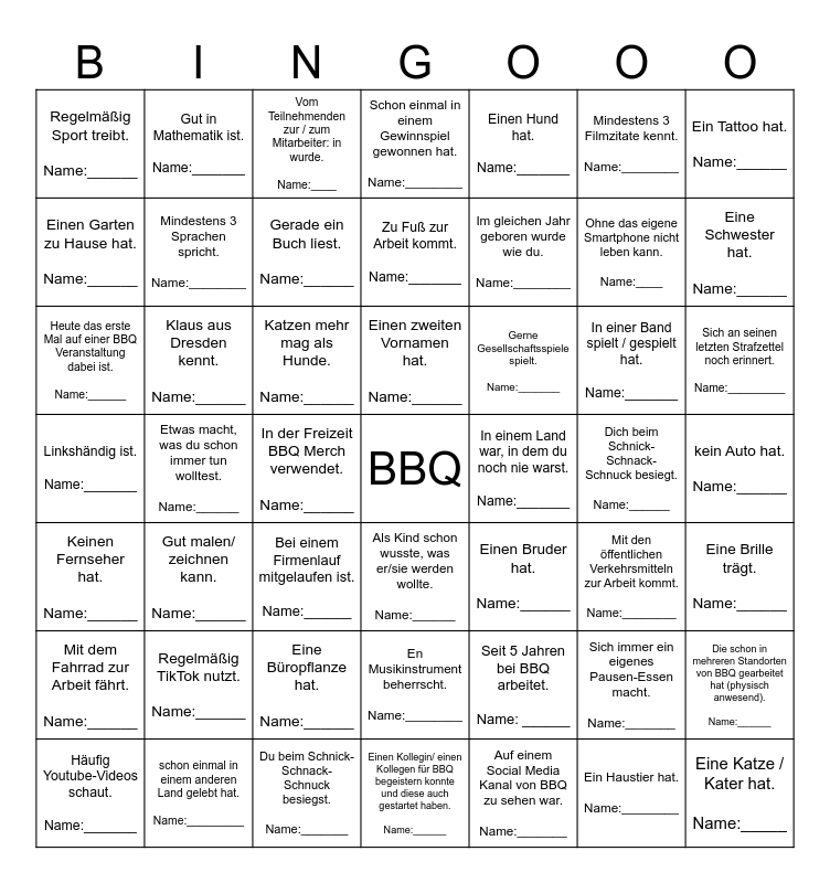 This bingo card has a free space and 48 words: Seit 5 Jahren bei BBQ arbeitet. Name: ______, Ohne das eigene Smartphone nicht leben kann. Name:____, Einen Kollegin/ einen Kollegen für BBQ begeistern konnte und diese auch gestartet haben. Name:______, Etwas macht, was du schon immer tun wolltest. Name:______, Katzen mehr mag als Hunde. Name:______, kein Auto hat. Name:______, Gut in Mathematik ist. Name:_______, schon einmal in einem anderen Land gelebt hat. Name:_________, Mindestens 3 Filmzitate kennt. Name:________, Als Kind schon wusste, was er/sie werden wollte. Name:______, Ein Tattoo hat. Name:______, Schon einmal in einem Gewinnspiel gewonnen hat. Name:________, In einer Band spielt / gespielt hat. Name:_______, Gerne Gesellschaftsspiele spielt. Name:_______, Mit dem Fahrrad zur Arbeit fährt. Name:______, Dich beim Schnick-Schnack-Schnuck besiegt. Name:______, Einen Garten zu Hause hat. Name:______, Eine Schwester hat. Name:______, Sich immer ein eigenes Pausen-Essen macht. Name:_______, Einen Hund hat. Name:_______, Im gleichen Jahr geboren wurde wie du. Name:________, In der Freizeit BBQ Merch verwendet. Name:______, Regelmäßig Sport treibt. Name:______, Mindestens 3 Sprachen spricht. Name:________, Die schon in mehreren Standorten von BBQ gearbeitet hat (physisch anwesend). Name:______, Gerade ein Buch liest. Name:______, Sich an seinen letzten Strafzettel noch erinnert. Name:_________, Häufig Youtube-Videos schaut. Name:_______, Einen zweiten Vornamen hat. Name:______, Klaus aus Dresden kennt. Name:______, Ein Haustier hat. Name:________, In einem Land war, in dem du noch nie warst. Name:_______, Eine Brille trägt. Name:______, Regelmäßig TikTok nutzt. Name:______, Linkshändig ist. Name:_______, Einen Bruder hat. Name:______, Mit den öffentlichen Verkehrsmitteln zur Arbeit kommt. Name:________, Heute das erste Mal auf einer BBQ Veranstaltung dabei ist. Name:______, Bei einem Firmenlauf mitgelaufen ist. Name:______, Eine Büropflanze hat. Name:______, Keinen Fernseher hat. Name:______, Eine Katze / Kater hat. Name:_____, Vom Teilnehmenden zur / zum Mitarbeiter: in wurde. Name:____, Du beim Schnick-Schnack-Schnuck besiegst. Name:_______, Zu Fuß zur Arbeit kommt. Name:_______, En Musikinstrument beherrscht. Name:________, Gut malen/ zeichnen kann. Name:______ and Auf einem Social Media Kanal von BBQ zu sehen war. Name:_______.