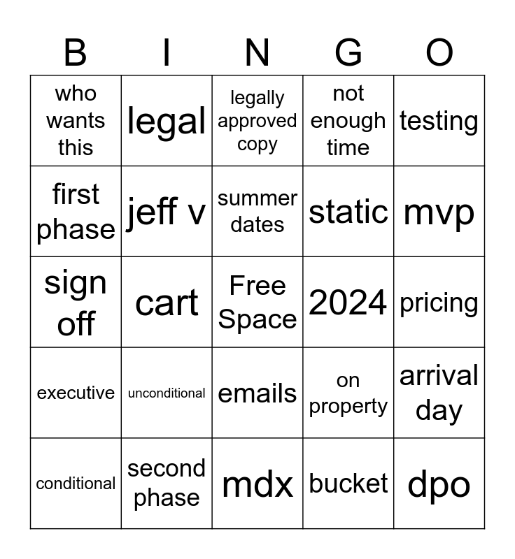 This bingo card has a free space and 24 words: conditional, unconditional, summer dates, bucket, testing, who wants this, legal, legally approved copy, 2024, pricing, sign off, jeff v, on property, arrival day, first phase, second phase, mdx, not enough time, mvp, executive, cart, emails, static and dpo.