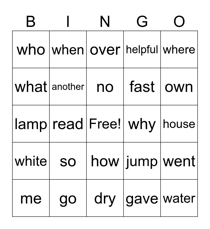This bingo card has a free space and 24 words: so, go, no, me, where, who, what, when, why, how, fast, lamp, jump, went, another, gave, house, over, own, read, water, white, helpful and dry.