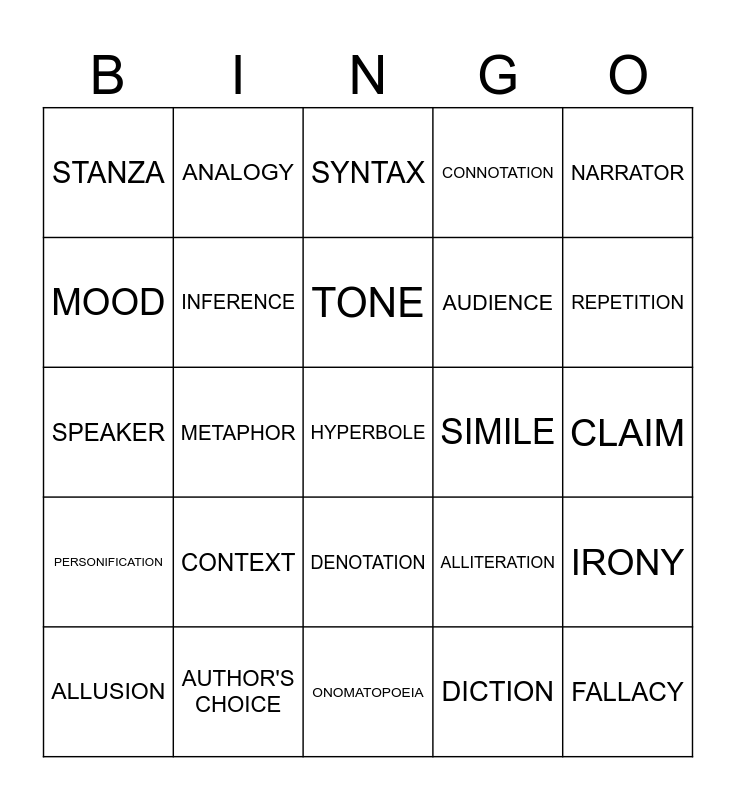 This bingo card has 35 words: DICTION, MAIN IDEA, THEME, INFERENCE, DENOTATION, CONNOTATION, MOOD, RHETORIC, TONE, FICTION, SPEAKER, NARRATOR, FREE VERSE, NARRATIVE, STANZA, SIMILE, DICTION, METAPHOR, PERSONIFICATION, HYPERBOLE, ALLITERATION, ALLUSION, IRONY, AUTHOR'S CHOICE, SYNTAX, REPETITION, FALLACY, COUNTERCLAIM, AUDIENCE, CLAIM, PLOT, ONOMATOPOEIA, CONTEXT, ANALOGY and PATHOS.