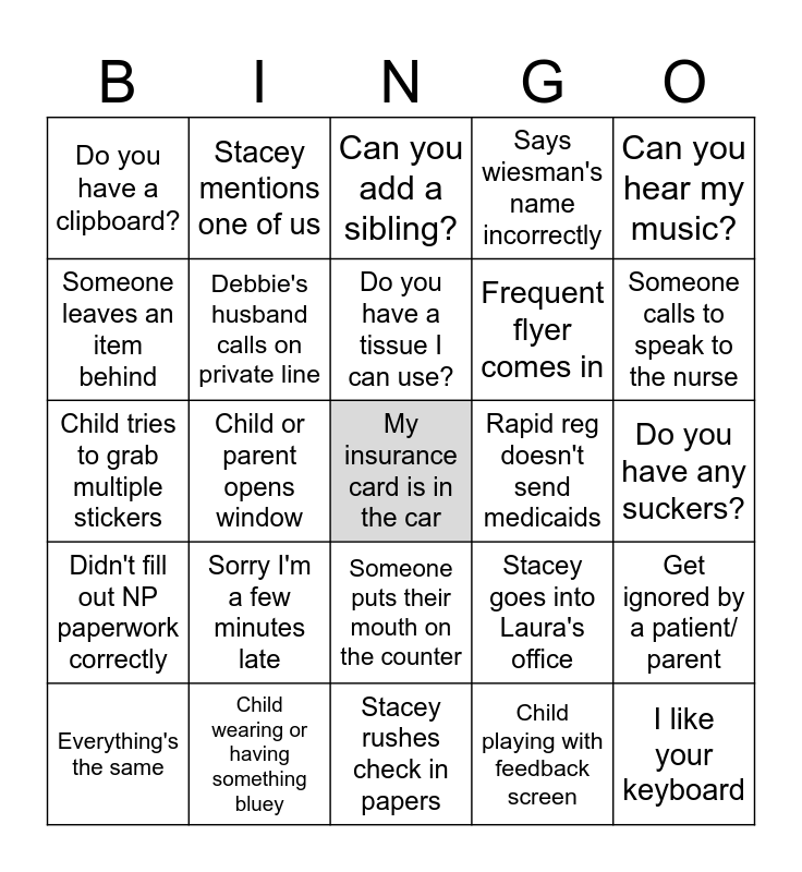 This bingo card has a free space and 24 words: Everything's the same, Sorry I'm a few minutes late, Do you have a tissue I can use?, Child playing with feedback screen, Can you hear my music?, Do you have a clipboard?, Stacey mentions one of us, Can you add a sibling?, Rapid reg doesn't send medicaids, Do you have any suckers?, Child tries to grab multiple stickers, Debbie's husband calls on private line, Stacey goes into Laura's office, Get ignored by a patient/ parent, Someone leaves an item behind, Child wearing or having something bluey, Stacey rushes check in papers, Says wiesman's name incorrectly, Someone calls to speak to the nurse, Didn't fill out NP paperwork correctly, Child or parent opens window, Someone puts their mouth on the counter, Frequent flyer comes in and I like your keyboard.