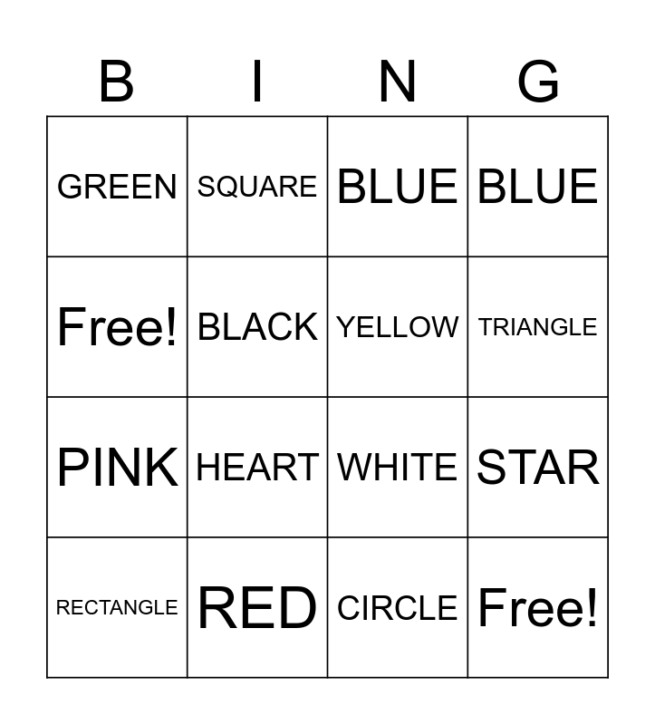 This bingo card has 16 words: RED, STAR, BLUE, GREEN, PINK, SQUARE, WHITE, CIRCLE, Free!, BLACK, RECTANGLE, BLUE, HEART, TRIANGLE, YELLOW and Free!.