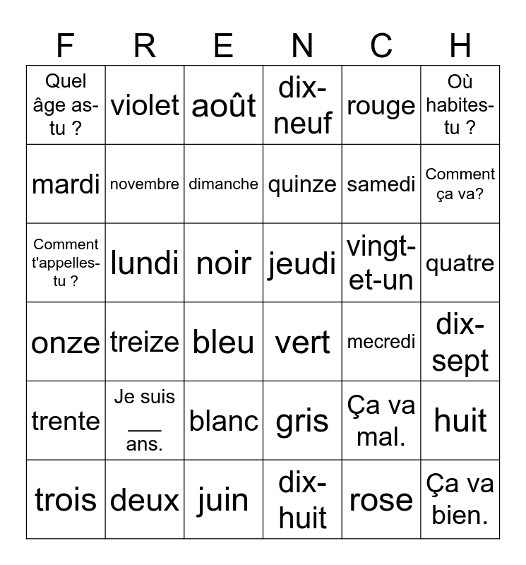 This bingo card has 48 words: trente, lundi, janvier, dix-neuf, mecredi, Ça va bien., Quel âge as-tu ?, septembre, août, vert, samedi, Où habites-tu ?, Comment t'appelles-tu ?, Je suis ___ ans., Je m'appelle _______., jeudi, vingt-et-un, quatre, trois, violet, noir, quinze, rouge, Comment ça va?, juillet, novembre, bleu, trente-et -un, Ça va mal., dix-sept, avril, deux, juin, gris, rose, quatorze, onze, treize, blanc, dix-huit, un, huit, mardi, vendredi, dimanche, décembre, anniversaire and calendrier.