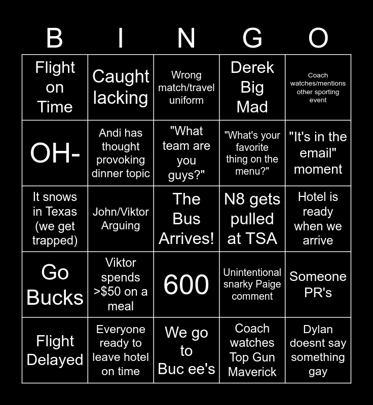 This bingo card has a free space and 24 words: Viktor spends >$50 on a meal, Everyone ready to leave hotel on time, "What team are you guys?", Flight Delayed, Coach watches/mentions other sporting event, Flight on Time, OH-, Caught lacking, N8 gets pulled at TSA, 600, "What's your favorite thing on the menu?", It snows in Texas (we get trapped), Unintentional snarky Paige comment, Someone PR's, Andi has thought provoking dinner topic, Coach watches Top Gun Maverick, Hotel is ready when we arrive, Wrong match/travel uniform, "It's in the email" moment, John/Viktor Arguing, Dylan doesnt say something gay, Go Bucks, Derek Big Mad and We go to Buc ee's.