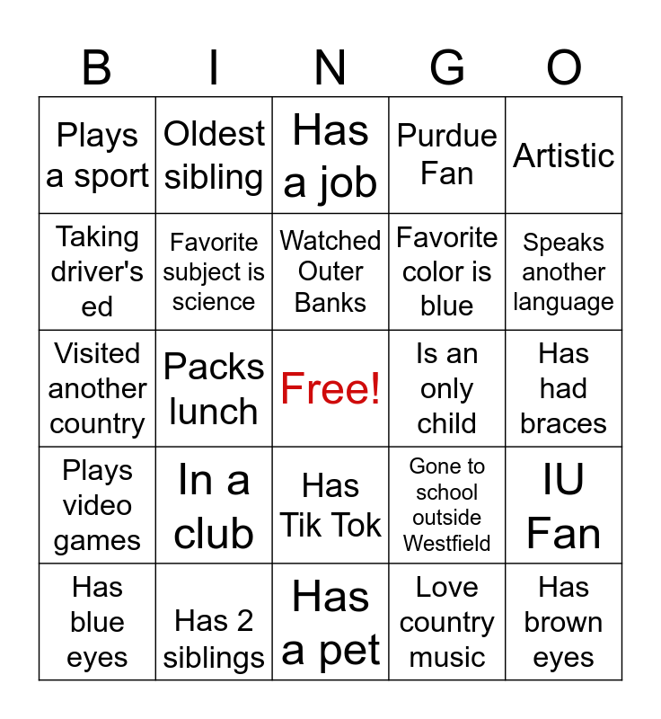 This bingo card has a free space and 24 words: In a club, Has 2 siblings, Watched Outer Banks, Has blue eyes, Artistic, Plays a sport, Taking driver's ed, Oldest sibling, Is an only child, Has Tik Tok, Favorite color is blue, Visited another country, Gone to school outside Westfield, IU Fan, Favorite subject is science, Love country music, Has had braces, Has a job, Speaks another language, Packs lunch, Has brown eyes, Plays video games, Purdue Fan and Has a pet.