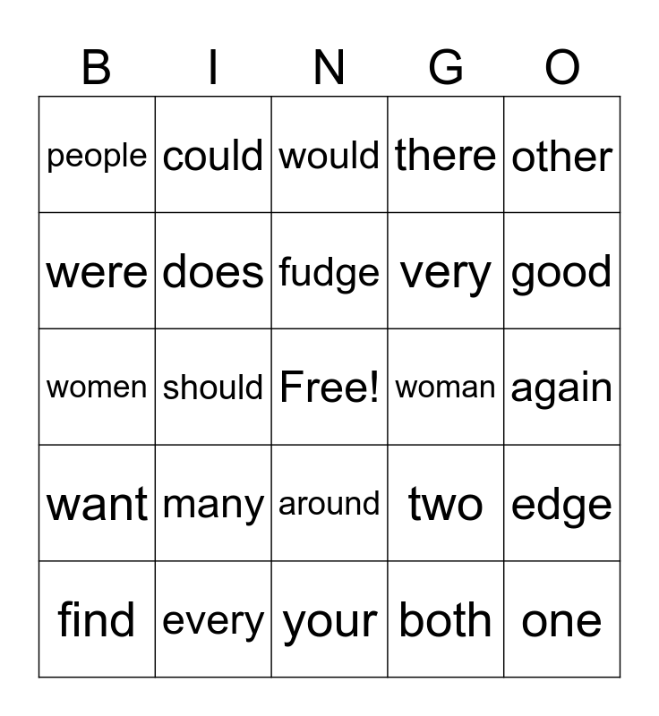 This bingo card has a free space and 24 words: many, every, fudge, find, other, people, were, could, woman, around, very, women, two, edge, does, both, again, would, good, should, one, want, there and your.