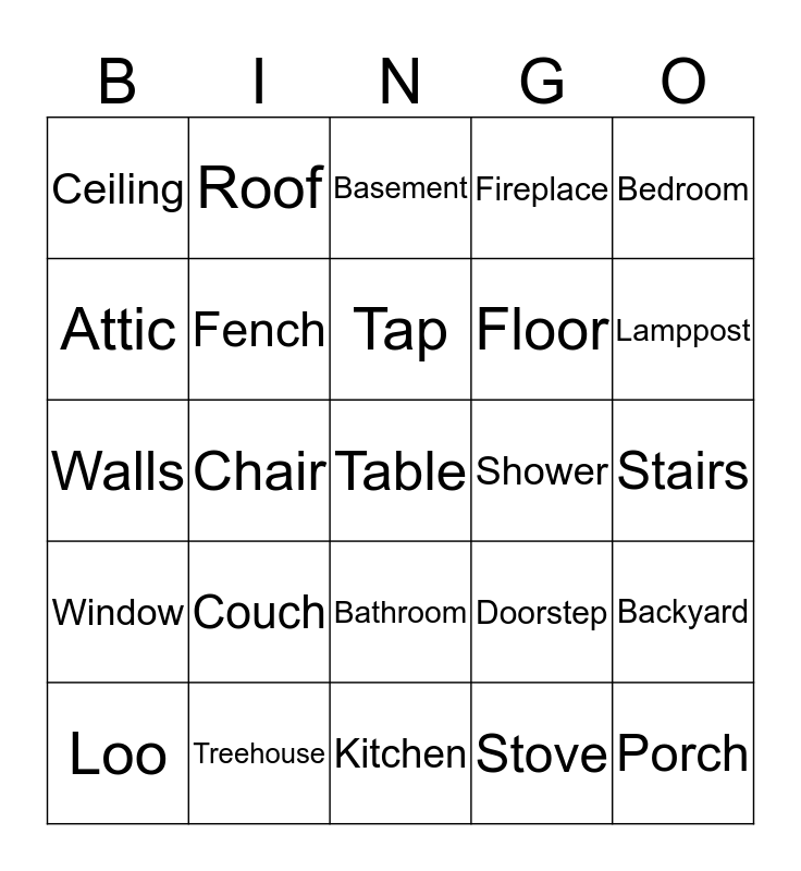 This bingo card has 25 words: Couch, Kitchen, Tap, Loo, Bedroom, Ceiling, Attic, Roof, Shower, Bathroom, Floor, Walls, Doorstep, Backyard, Fench, Porch, Stairs, Basement, Lamppost, Chair, Table, Treehouse, Window, Fireplace and Stove.