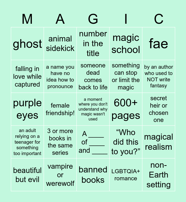 This bingo card has 38 words: dragon, wyvern, shadow daddy, a name you have no idea how to pronounce, magical realism, 3 or more books in the same series, someone dead comes back to life, someone real and historical was actually magical, fae, something can stop or limit the magic, female friendship!, magic school, a moment where you don't understand why magic wasn't used, secret heir or chosen one, falling in love while captured, an adult relying on a teenager for something too important, exile, number in the title, reversed curse, 600+ pages, ghost, vampire or werewolf, by an author who used to NOT write fantasy, beautiful but evil, the most beautiful person / being ever as main love interest, banned books, non-Earth setting, new power revealed at critical moment, beloved character death, food you wouldn’t eat, time travel, A ____ of ____ and ____, LGBTQIA+ romance, animal sidekick, telepathy, “Who did this to you?”, purple eyes and a one word title.