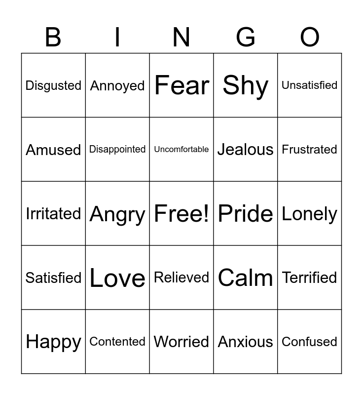 This bingo card has a free space and 29 words: Happy, Sad, Angry, Excited, Disgusted, Fear, Disappointed, Love, Pride, Contented, Lonely, Confused, Worried, Anxious, Frustrated, Troubled, Relieved, Satisfied, Unsatisfied, Irritated, Calm, Surprised, Jealous, Amused, Shy, Annoyed, Terrified, Uncomfortable and Comfortable.