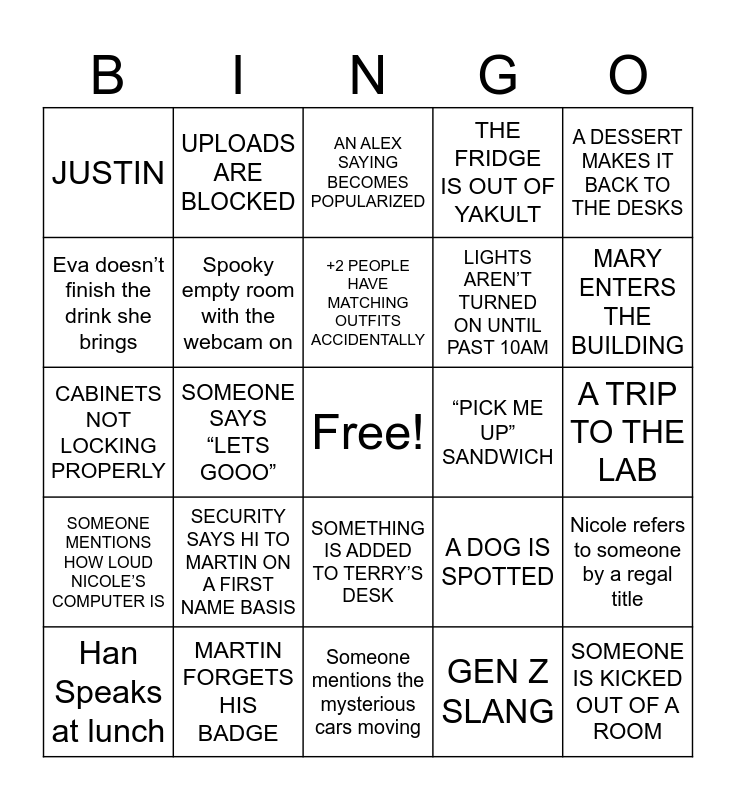 This bingo card has a free space and 28 words: Nicole refers to someone by a regal title, 3+ PEOPLE WEAR A BLACK TURTLENECK, LIGHTS AREN’T TURNED ON UNTIL PAST 10AM, GEN Z SLANG, Eva doesn’t finish the drink she brings, AN ALEX SAYING BECOMES POPULARIZED, UPLOADS ARE BLOCKED, SOMEONE MENTIONS HOW LOUD NICOLE’S COMPUTER IS, “PICK ME UP” SANDWICH, Han Speaks at lunch, CABINETS NOT LOCKING PROPERLY, THE FRIDGE IS OUT OF YAKULT, MARTIN FORGETS HIS BADGE, Someone mentions the mysterious cars moving, MARY ENTERS THE BUILDING, BUTTERFLY BOT GOES CRAZY, SECURITY SAYS HI TO MARTIN ON A FIRST NAME BASIS, Spooky empty room with the webcam on, +2 PEOPLE HAVE MATCHING OUTFITS ACCIDENTALLY, SOMETHING IS ADDED TO TERRY’S DESK, JUSTIN, SOMEONE ADJUSTS THE BLINDS, SOMEONE IS KICKED OUT OF A ROOM, SOMEONE SAYS “LETS GOOO”, A TRIP TO THE LAB, A DOG IS SPOTTED, A DESSERT MAKES IT BACK TO THE DESKS and HIDDEN COASTER.