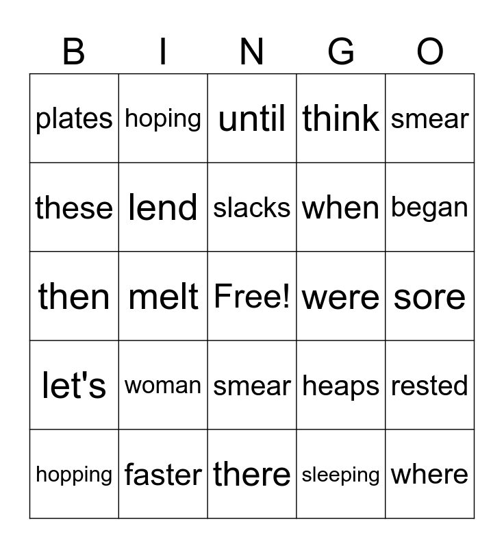 This bingo card has a free space and 24 words: woman, faster, slacks, hopping, smear, plates, these, hoping, were, smear, when, then, heaps, rested, lend, sleeping, sore, until, began, melt, where, let's, think and there.
