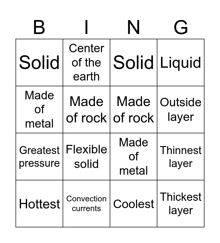 This bingo card has 17 words: Coolest, Hottest, Solid, Solid, Flexible solid, Liquid, Thinnest layer, Made of rock, Outside layer, Made of rock, Convection currents, Made of metal, Made of metal, Center of the earth, Greatest pressure, We live on this layer and Thickest layer.
