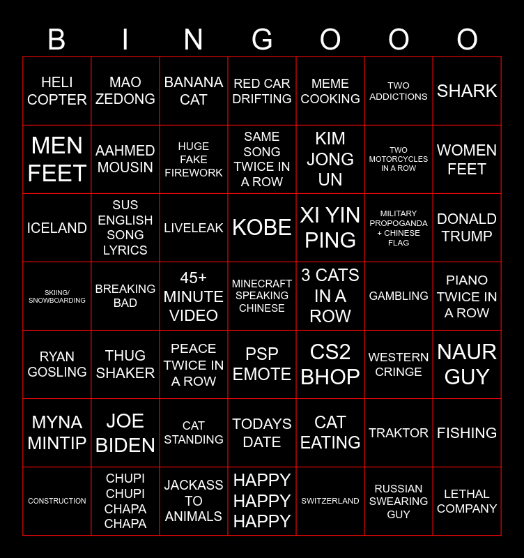 This bingo card has a free space and 48 words: CAT EATING, TWO MOTORCYCLES IN A ROW, HAPPY HAPPY HAPPY, BREAKING BAD, LIVELEAK, PIANO TWICE IN A ROW, MAO ZEDONG, CHUPI CHUPI CHAPA CHAPA, TWO ADDICTIONS, PSP EMOTE, SHARK, RED CAR DRIFTING, MILITARY PROPOGANDA + CHINESE FLAG, XI YIN PING, MYNA MINTIP, GAMBLING, MEN FEET, WOMEN FEET, TRAKTOR, MEME COOKING, KIM JONG UN, 45+ MINUTE VIDEO, HELI COPTER, AAHMED MOUSIN, FISHING, HUGE FAKE FIREWORK, DONALD TRUMP, CONSTRUCTION, KOBE, SUS ENGLISH SONG LYRICS, RUSSIAN SWEARING GUY, 3 CATS IN A ROW, NAUR GUY, JOE BIDEN, SKIING/ SNOWBOARDING, CS2 BHOP, WESTERN CRINGE, ICELAND, PEACE TWICE IN A ROW, CAT STANDING, RYAN GOSLING, LETHAL COMPANY, BANANA CAT, JACKASS TO ANIMALS, SAME SONG TWICE IN A ROW, TODAYS DATE, THUG SHAKER and SWITZERLAND.