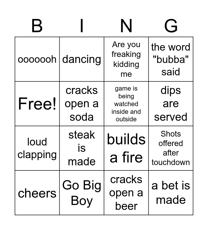 This bingo card has 16 words: Go Big Boy, Shots offered after touchdown, Are you freaking kidding me, ooooooh, loud clapping, dancing, builds a fire, cracks open a beer, Free!, cracks open a soda, cheers, the word "bubba" said, steak is made, dips are served, game is being watched inside and outside and a bet is made.