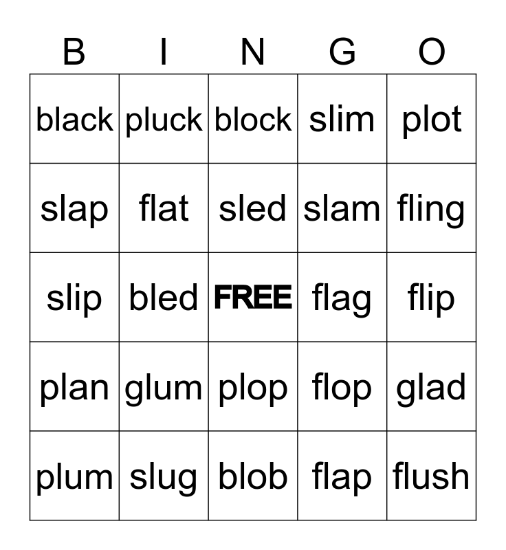 This bingo card has a free space and 31 words: blob, blast, bled, blush, black, block, flat, flop, flag, flap, flip, flush, flash, flick, fling, flung, glad, glum, plan, plop, plot, plug, plum, pluck, slam, slap, slim, slip, slug, sled and sling.