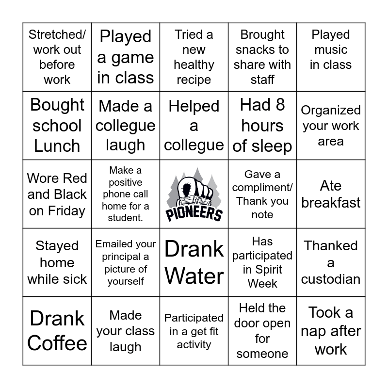 This bingo card has a free space and 24 words: Emailed your principal a picture of yourself, Made your class laugh, Helped a collegue, Drank Coffee, Played music in class, Stretched/ work out before work, Bought school Lunch, Played a game in class, Gave a compliment/ Thank you note, Drank Water, Had 8 hours of sleep, Wore Red and Black on Friday, Has participated in Spirit Week, Thanked a custodian, Made a collegue laugh, Held the door open for someone, Ate breakfast, Tried a new healthy recipe, Organized your work area, Make a positive phone call home for a student., Took a nap after work, Stayed home while sick, Brought snacks to share with staff and Participated in a get fit activity.
