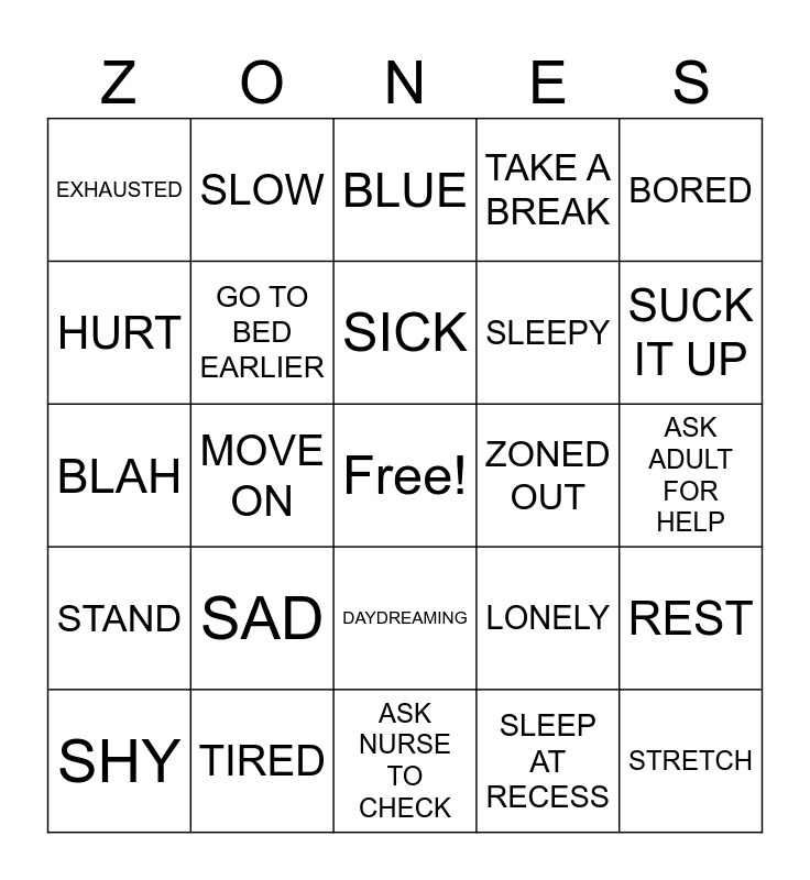 This bingo card has a free space and 24 words: SAD, TIRED, SICK, SHY, BORED, EXHAUSTED, HURT, SLOW, ZONED OUT, DAYDREAMING, SLEEPY, BLAH, LONELY, REST, GO TO BED EARLIER, SLEEP AT RECESS, ASK ADULT FOR HELP, BLUE, SUCK IT UP, MOVE ON, STRETCH, STAND, TAKE A BREAK and ASK NURSE TO CHECK.