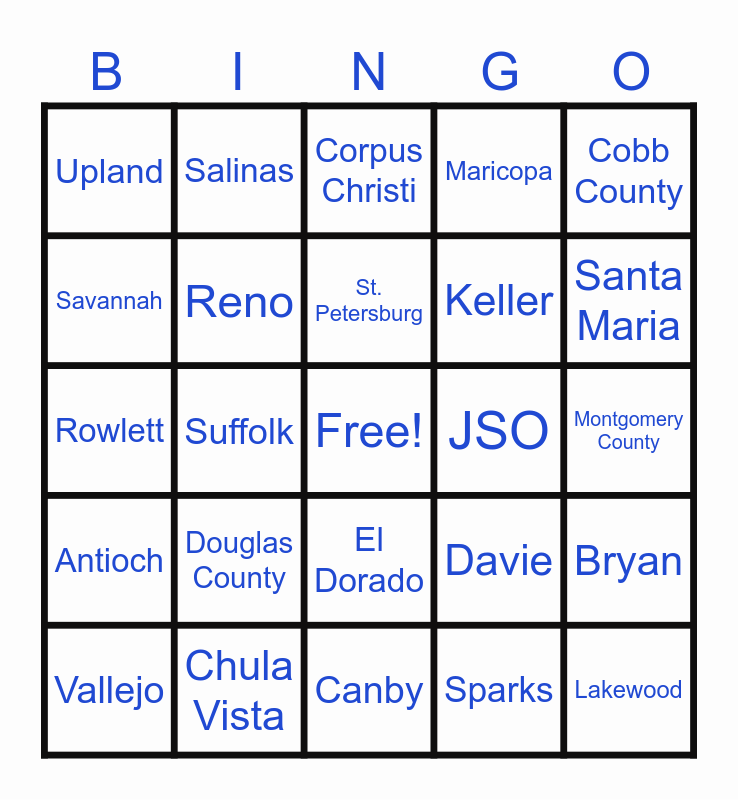 This bingo card has a free space and 24 words: Vallejo, Douglas County, St. Petersburg, Sparks, Cobb County, Upland, Salinas, Corpus Christi, JSO, Montgomery County, Rowlett, Reno, Davie, Bryan, Savannah, Chula Vista, Canby, Maricopa, Santa Maria, Antioch, Suffolk, El Dorado, Keller and Lakewood.