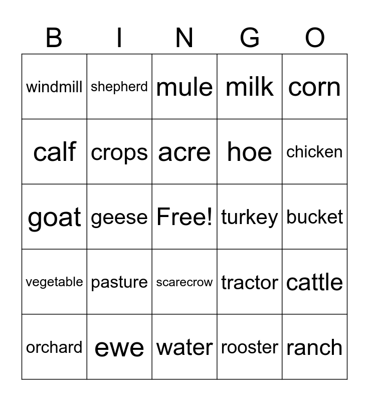 This bingo card has a free space and 31 words: water, horse, geese, gander, windmill, mule, crops, tractor, turkey, rooster, bucket, ranch, barn, bale, chicken, lamb, cattle, pasture, vegetable, scarecrow, corn, beehive, orchard, shepherd, hoe, calf, milk, goat, ewe, acre and calf.