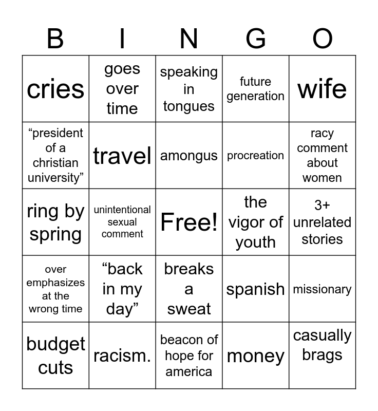 This bingo card has a free space and 24 words: “back in my day”, racism., amongus, budget cuts, wife, cries, “president of a christian university”, goes over time, the vigor of youth, breaks a sweat, procreation, ring by spring, spanish, missionary, travel, money, 3+ unrelated stories, speaking in tongues, racy comment about women, unintentional sexual comment, casually brags, over emphasizes at the wrong time, future generation and beacon of hope for america.