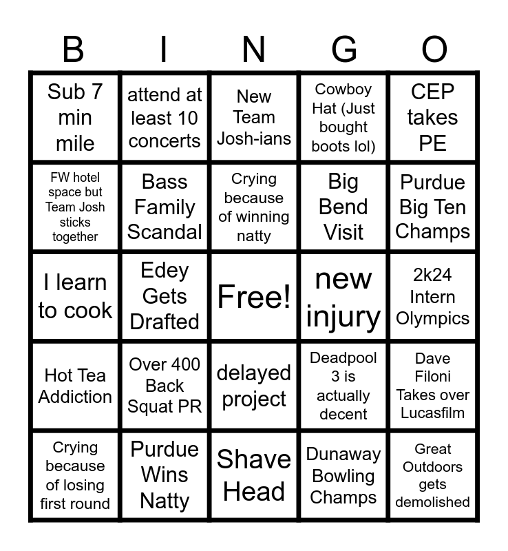This bingo card has a free space and 24 words: Over 400 Back Squat PR, Purdue Wins Natty, Crying because of winning natty, Crying because of losing first round, CEP takes PE, Sub 7 min mile, FW hotel space but Team Josh sticks together, attend at least 10 concerts, new injury, delayed project, Big Bend Visit, I learn to cook, Deadpool 3 is actually decent, Dave Filoni Takes over Lucasfilm, Bass Family Scandal, Dunaway Bowling Champs, 2k24 Intern Olympics, New Team Josh-ians, Purdue Big Ten Champs, Edey Gets Drafted, Great Outdoors gets demolished, Hot Tea Addiction, Cowboy Hat (Just bought boots lol) and Shave Head.