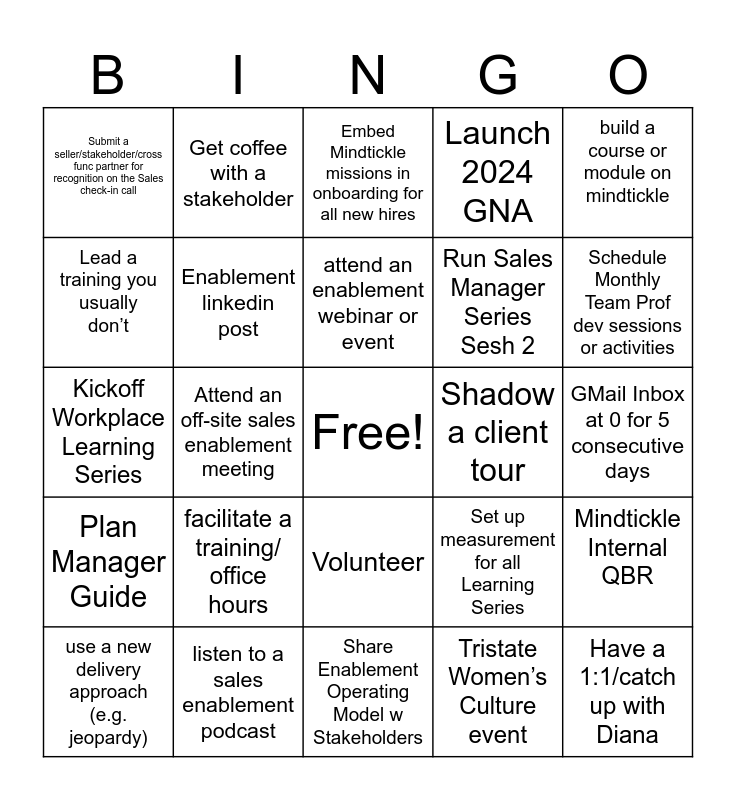 This bingo card has a free space and 24 words: facilitate a training/ office hours, listen to a sales enablement podcast, attend an enablement webinar or event, use a new delivery approach (e.g. jeopardy), build a course or module on mindtickle, Submit a seller/stakeholder/cross func partner for recognition on the Sales check-in call, Lead a training you usually don’t, Get coffee with a stakeholder, Shadow a client tour, Volunteer, Run Sales Manager Series Sesh 2, Kickoff Workplace Learning Series, Set up measurement for all Learning Series, Mindtickle Internal QBR, Enablement linkedin post, Tristate Women’s Culture event, GMail Inbox at 0 for 5 consecutive days, Embed Mindtickle missions in onboarding for all new hires, Schedule Monthly Team Prof dev sessions or activities, Attend an off-site sales enablement meeting, Have a 1:1/catch up with Diana, Plan Manager Guide, Launch 2024 GNA and Share Enablement Operating Model w Stakeholders.
