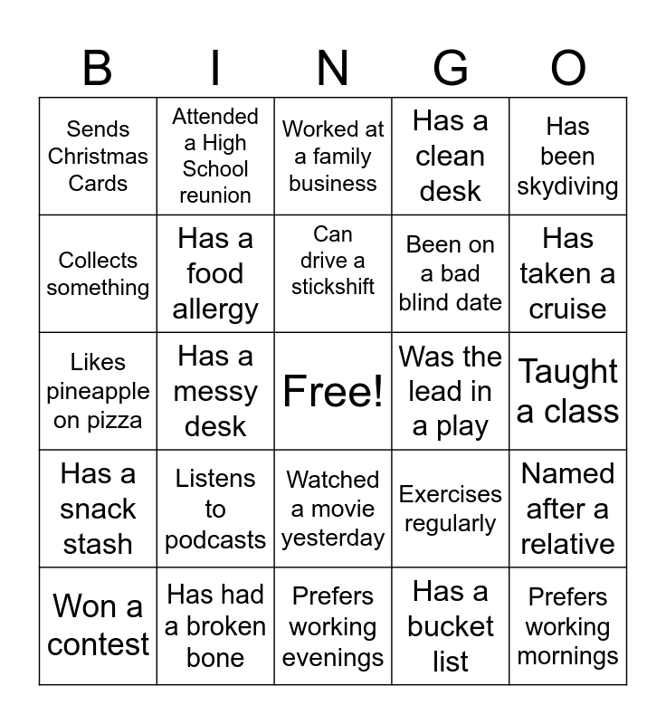 This bingo card has a free space and 24 words: Listens to podcasts, Has had a broken bone, Can drive a stickshift, Won a contest, Has been skydiving, Sends Christmas Cards, Collects something, Attended a High School reunion, Was the lead in a play, Watched a movie yesterday, Been on a bad blind date, Likes pineapple on pizza, Exercises regularly, Named after a relative, Has a food allergy, Has a bucket list, Taught a class, Worked at a family business, Has taken a cruise, Has a messy desk, Prefers working mornings, Has a snack stash, Has a clean desk and Prefers working evenings.
