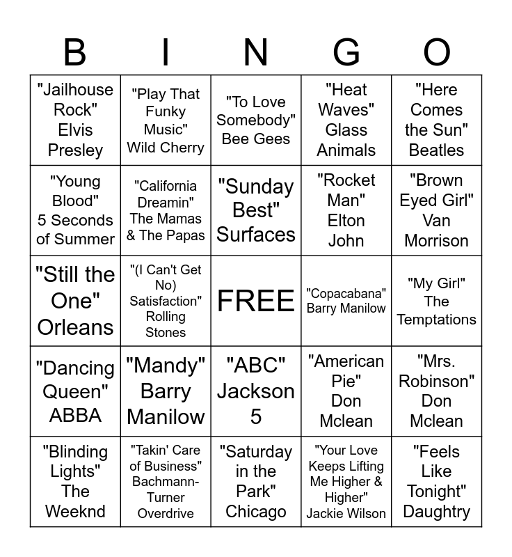 This bingo card has a free space and 24 words: "Mandy" Barry Manilow, "Takin' Care of Business" Bachmann-Turner Overdrive, "Sunday Best" Surfaces, "Blinding Lights" The Weeknd, "Here Comes the Sun" Beatles, "Jailhouse Rock" Elvis Presley, "Young Blood" 5 Seconds of Summer, "Play That Funky Music" Wild Cherry, "Copacabana" Barry Manilow, "ABC" Jackson 5, "Rocket Man" Elton John, "Still the One" Orleans, "American Pie" Don Mclean, "Mrs. Robinson" Don Mclean, "California Dreamin" The Mamas & The Papas, "Your Love Keeps Lifting Me Higher & Higher" Jackie Wilson, "My Girl" The Temptations, "To Love Somebody" Bee Gees, "Brown Eyed Girl" Van Morrison, "(I Can't Get No) Satisfaction" Rolling Stones, "Feels Like Tonight" Daughtry, "Dancing Queen" ABBA, "Heat Waves" Glass Animals and "Saturday in the Park" Chicago.