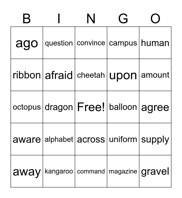 This bingo card has a free space and 28 words: supply, purchase, upon, magazine, ribbon, convince, question, aware, balloon, away, octopus, campus, kangaroo, command, amount, nickel, alphabet, afraid, cheetah, across, ago, occur, gravel, dragon, agree, uniform, human and harmony.