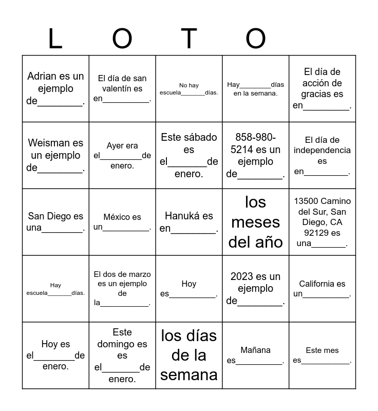 This bingo card has 26 words: Hoy es__________., Mañana es__________., Este sábado es el_______de enero., Este domingo es es el_______de enero., El día de acción de gracias es en_________., Adrian es un ejemplo de________., Weisman es un ejemplo de________., El día de san valentín es en__________., 13500 Camino del Sur, San Diego, CA 92129 es una_______., 2023 es un ejemplo de________., 858-980-5214 es un ejemplo de________., San Diego es una________., California es un__________., Hoy es el________de enero., México es un__________., Hay _____meses en un año., Hay________días en la semana., Hay escuela_______días., No hay escuela_______días., Hanuká es en________., El día de independencia es en_________., los días de la semana, los meses del año, El dos de marzo es un ejemplo de la___________., Ayer era el_________de enero. and Este mes es___________..