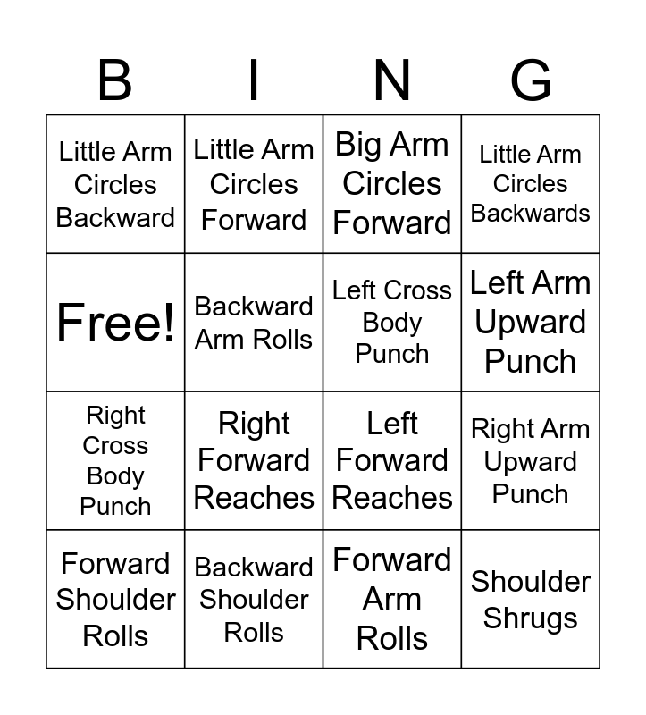 This bingo card has 16 words: Backward Shoulder Rolls, Right Arm Upward Punch, Big Arm Circles Forward, Little Arm Circles Backward, Right Cross Body Punch, Little Arm Circles Forward, Left Forward Reaches, Forward Arm Rolls, Free!, Backward Arm Rolls, Forward Shoulder Rolls, Little Arm Circles Backwards, Right Forward Reaches, Left Arm Upward Punch, Left Cross Body Punch and Shoulder Shrugs.