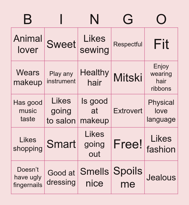 This bingo card has 25 words: Smart, Smells nice, Healthy hair, Doesn’t have ugly fingernails, Fit, Animal lover, Wears makeup, Sweet, Extrovert, Likes going out, Mitski, Has good music taste, Free!, Likes fashion, Play any instrument, Jealous, Physical love language, Likes sewing, Enjoy wearing hair ribbons, Likes going to salon, Is good at makeup, Good at dressing, Likes shopping, Respectful and Spoils me.