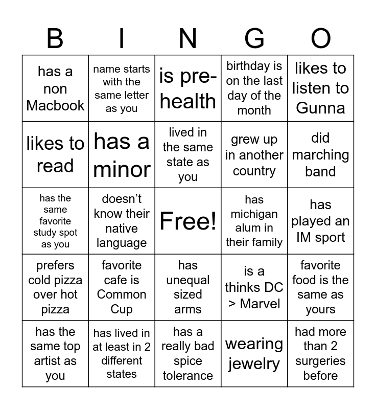 This bingo card has a free space and 66 words: the same number of siblings as you, is doing the same major as you, outfit is unique?, favorite food is the same as yours, favorite color is the same as yours, you haven’t met before, name starts with the same letter as you, same height as you, lived in the same state as you, enjoys league of legends, has unequal sized arms, hates animals, has played an IM sport, likes to listen to Gunna, did not watch the national championship, likes to read, doesn’t know their native language, has a non Macbook, major in CS, grew up in another country, favorite cafe is Common Cup, prefers cold pizza over hot pizza, birthday is on the last day of the month, birthday is on the first day of the month, has the same birthday month as you, has had braces before, has broken a bone before(whichever is more uncommon), likes country music, had more than 2 surgeries before, was born in the same year as you but are in a different grade, has the same top artist as you, outfit is monochromatic, has pet(s), can touch their toes, is a thinks DC > Marvel, has lived in at least in 2 different states, can play musical instrument(s), has the same favorite study spot as you, wearing jewelry, was/is in a harvest lg, has a minor, has less than 10 emails in their inbox, has michigan alum in their family, has visited 2+ continents, loves roller coasters, has burnt food while cooking before, did marching band, phone screen is cracked, still has their wisdom teeth, has never left the country, has gotten lost in the woods, is a twin or has twins in their family, has tried skydiving or bungee jumping, can juggle more than three items at once, has been to more than 4 Michigan football games this school year, has worked in food service, owns an Owala brand water bottle, would consider themselves good at cooking, is pre-health, has a really bad spice tolerance, showed up late to LG, wears contacts, Traveled out of country for the break, is left handed, is Non iphone user and First time at AIV.