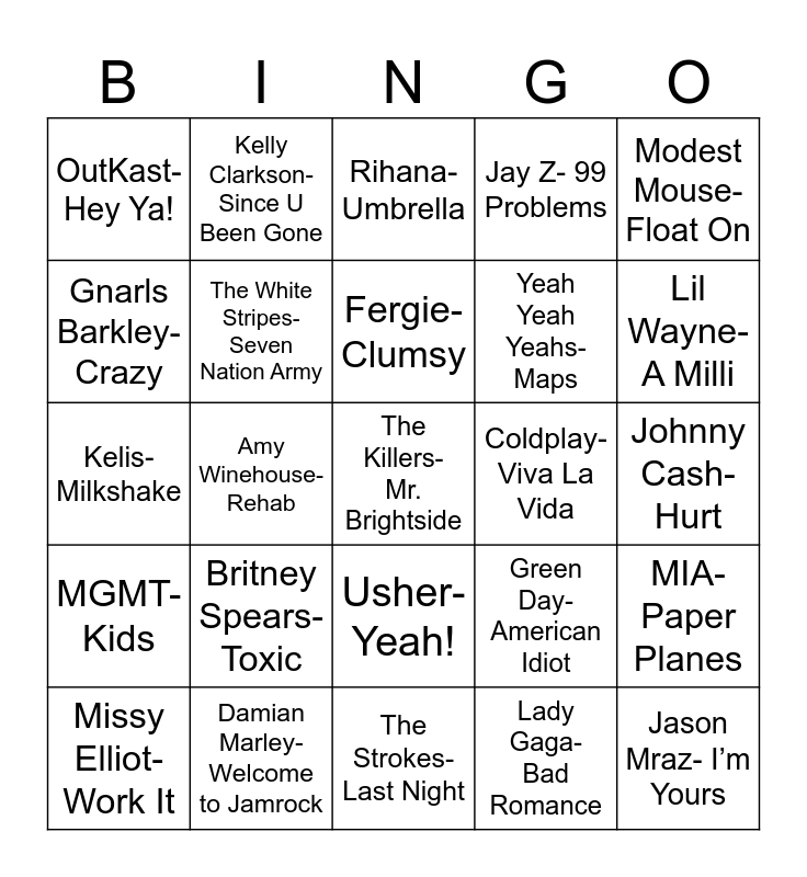 This bingo card has 30 words: Damian Marley- Welcome to Jamrock, Gorillaz- Feel Good Inc., Amy Winehouse- Rehab, TV On The Radio- Wolf Like Me, OutKast- Hey Ya!, Rihana- Umbrella, The White Stripes- Seven Nation Army, Usher- Yeah!, Coldplay- Viva La Vida, The Strokes- Last Night, Johnny Cash- Hurt, The Killers- Mr. Brightside, Lady Gaga- Bad Romance, Jason Mraz- I’m Yours, Lil Wayne- A Milli, Beyonce- Single Ladies, Green Day- American Idiot, MGMT- Kids, Britney Spears- Toxic, Modest Mouse- Float On, Kelis- Milkshake, The Flaming Lips- Do You Realize?, Kelly Clarkson- Since U Been Gone, Yeah Yeah Yeahs- Maps, Gnarls Barkley- Crazy, Jay Z- 99 Problems, MIA- Paper Planes, Missy Elliot- Work It, Fergie- Clumsy and T.I.- Whatever You Like.