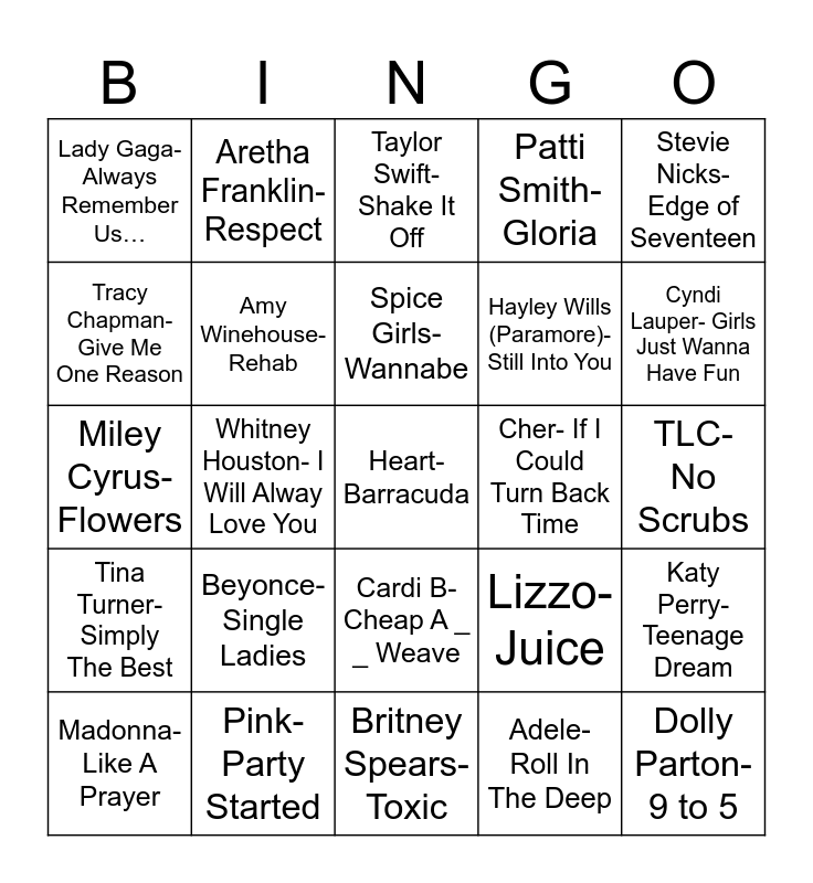 This bingo card has 29 words: Madonna- Like A Prayer, Rihanna- Diamonds, Whitney Houston- I Will Alway Love You, Dolly Parton- 9 to 5, Lady Gaga- Always Remember Us…, Taylor Swift-Shake It Off, Amy Winehouse- Rehab, Beyonce- Single Ladies, Cher- If I Could Turn Back Time, Pink- Party Started, TLC-No Scrubs, Heart- Barracuda, Britney Spears- Toxic, Adele- Roll In The Deep, Cyndi Lauper- Girls Just Wanna Have Fun, Meghan The Stallion-Savage, Cardi B- Cheap A _ _ Weave, Tina Turner- Simply The Best, Stevie Nicks- Edge of Seventeen, Miley Cyrus- Flowers, Lizzo- Juice, Alanis Morissette- Ironic, Hayley Wills (Paramore)-Still Into You, Tracy Chapman- Give Me One Reason, Patti Smith- Gloria, Aretha Franklin- Respect, Katy Perry- Teenage Dream, Spice Girls- Wannabe and The Bangals- Walk Like an Egyptian.