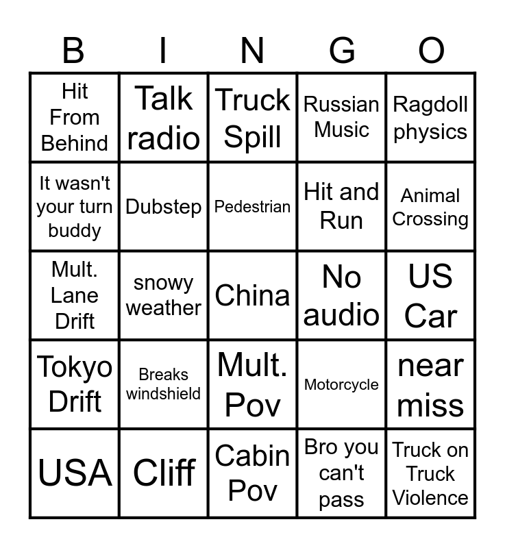 This bingo card has 45 words: Early 2000's Pop, China, India, USA, Where are the lights?, Bro you can't pass, Truck Spill, 4+ pile up, Ragdoll physics, Cliff, Russian Music, No audio, Mult. Pov, Breaks windshield, Breaks Camera, Cabin Pov, Backing up, Mult. Lane Drift, Visibility who needs it, Animal Crossing, Talk radio, Do a Flip, Road Rage, Hit From Behind, Russian Car, US Car, Lada, Guy flys out car, Motorcycle, Tokyo Drift, Spins outta nowhere, near miss, insurance scam, T-boned, 90 Degree angle, snowy weather, Train, Break check, Truck on Truck Violence, Pedestrian, It wasn't your turn buddy, Hit and Run, Wheel falls off, Dubstep and Bowling pins.