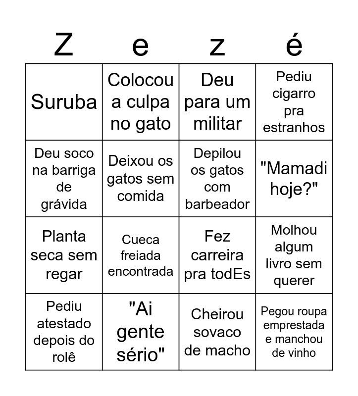 This bingo card has 16 words: "Ai gente sério", Molhou algum livro sem querer, Deu para um militar, Suruba, Planta seca sem regar, Colocou a culpa no gato, Fez carreira pra todEs, Cheirou sovaco de macho, Deu soco na barriga de grávida, Deixou os gatos sem comida, Pediu atestado depois do rolê, Pediu cigarro pra estranhos, Cueca freiada encontrada, "Mamadi hoje?", Depilou os gatos com barbeador and Pegou roupa emprestada e manchou de vinho.
