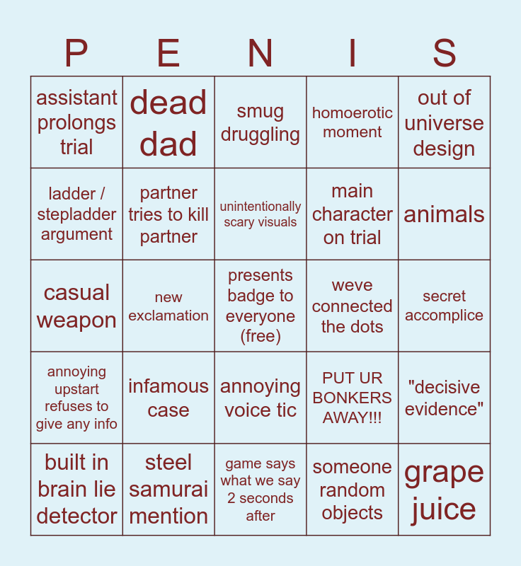This bingo card has a free space and 48 words: new mechanic, grape juice, minor character from previous game shows up, game says what we say 2 seconds after, infamous case, explosive breakdown, dead dad, gets poisoned, ladder / stepladder argument, flashback case, partner tries to kill partner, homoerotic moment, "decisive evidence", PUT UR BONKERS AWAY!!!, indiscernible pun name, kidnapping, unintentionally scary visuals, weve connected the dots, easter egg, out of universe design, new exclamation, someone random objects, assistant prolongs trial, main character on trial, judge is dumb dumb, animals, built in brain lie detector, she wants to be dahlia so bad, annoying voice tic, annoying upstart refuses to give any info, banger theme, murder on a transportation, career on the line, extreme consequences, steel samurai mention, weird old people, victim body moved multiple times, secret accomplice, tutorial case cocomelon, recalling comes in handy, vigilante time, clowns? spotted., smug druggling, non-murder case, casual weapon, cuntress, awhh... he's ugly and close examination (3d).