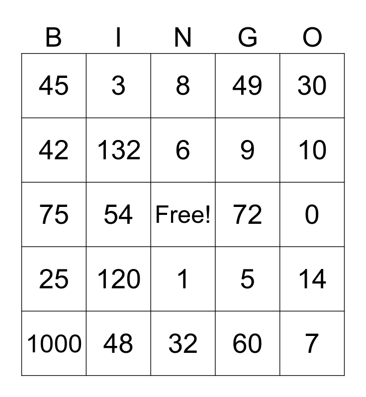 This bingo card has a free space and 24 words: 120, 48, 6, 1000, 30, 45, 42, 3, 72, 1, 9, 75, 5, 14, 132, 60, 0, 8, 10, 54, 7, 25, 49 and 32.