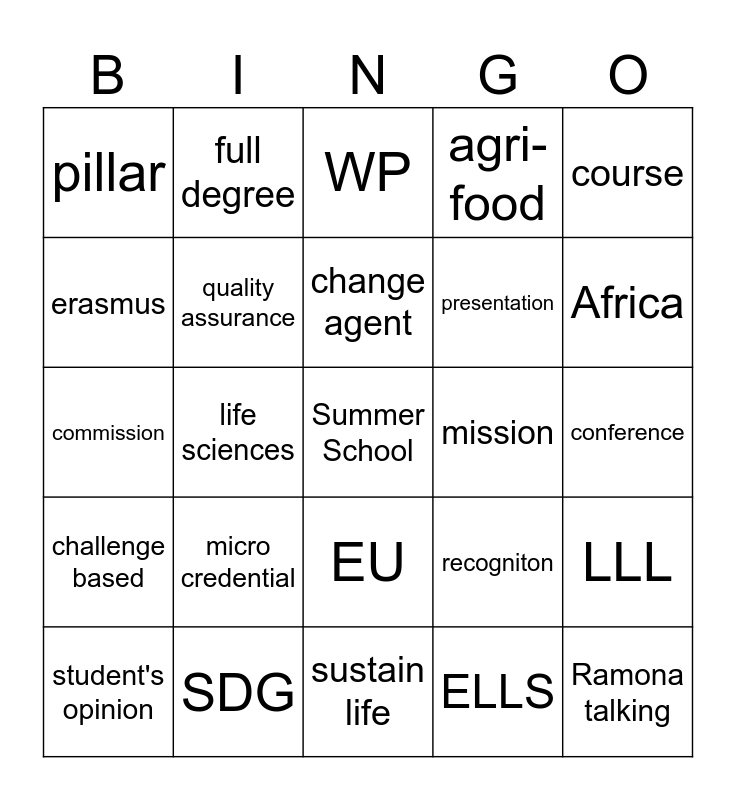 This bingo card has a free space and 24 words: micro credential, SDG, change agent, student's opinion, course, pillar, erasmus, full degree, mission, EU, presentation, commission, recogniton, LLL, quality assurance, ELLS, conference, WP, Africa, life sciences, Ramona talking, challenge based, agri-food and sustain life.