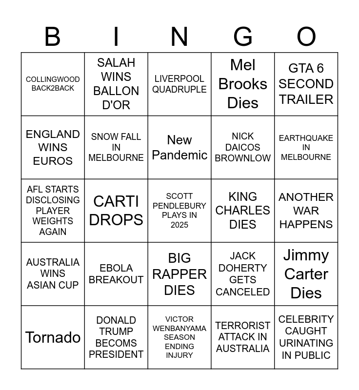 This bingo card has 30 words: DONALD TRUMP BECOMS PRESIDENT, VULTURES DOES NOT DROP, CARTI DROPS, "HOTTEST DAY EVER", COLLINGWOOD BACK2BACK, LIVERPOOL QUADRUPLE, SNOW FALL IN MELBOURNE, BIG RAPPER DIES, KING CHARLES DIES, VICTOR WENBANYAMA SEASON ENDING INJURY, ANOTHER WAR HAPPENS, SCOTT PENDLEBURY PLAYS IN 2025, TERRORIST ATTACK IN AUSTRALIA, CELEBRITY CAUGHT URINATING IN PUBLIC, EARTHQUAKE IN MELBOURNE, KSI VS JAKE PAUL HAPPENS/IS ANNOUNCED, JACK DOHERTY GETS CANCELED, AUSTRALIA WINS ASIAN CUP, EBOLA BREAKOUT, GTA 6 SECOND TRAILER, AFL STARTS DISCLOSING PLAYER WEIGHTS AGAIN, SIDEMEN STOP POSTING WEEKLY, SALAH WINS BALLON D'OR, NICK DAICOS BROWNLOW, ENGLAND WINS EUROS, Mel Brooks Dies, Jimmy Carter Dies, Tornado, New Pandemic and Country Closed Due to Snow.