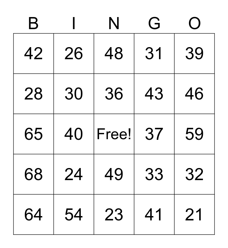 This bingo card has a free space and 50 words: 20, 21, 22, 23, 24, 25, 26, 27, 28, 29, 30, 31, 32, 33, 34, 35, 36, 37, 38, 39, 40, 41, 42, 43, 44, 45, 46, 47, 48, 49, 50, 51, 52, 53, 54, 55, 56, 57, 58, 59, 60, 61, 62, 63, 64, 65, 66, 67, 68 and 69.