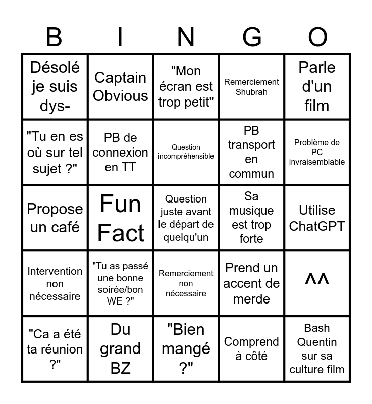 This bingo card has 25 words: "Tu as passé une bonne soirée/bon WE ?", "Bien mangé ?", Question incompréhensible, "Ca a été ta réunion ?", Parle d'un film, Désolé je suis dys-, "Tu en es où sur tel sujet ?", Captain Obvious, Sa musique est trop forte, Remerciement non nécessaire, PB transport en commun, Propose un café, Prend un accent de merde, ^^, PB de connexion en TT, Bash Quentin sur sa culture film, Utilise ChatGPT, "Mon écran est trop petit", Problème de PC invraisemblable, Fun Fact, Question juste avant le départ de quelqu'un, Du grand BZ, Intervention non nécessaire, Remerciement Shubrah and Comprend à côté.