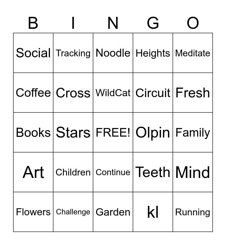 This bingo card has a free space and 32 words: kl, dmk, Stars, Shuffle, Art, Cross, Meditate, Mind, Tracking, Service, WildCat, Noodle, 16, Wrench, Olpin, Tube, Flowers, Books, Continue, Children, Teeth, Passes, Family, Challenge, Running, Heights, Circuit, Coffee, Social, Garden, Hall and Fresh.