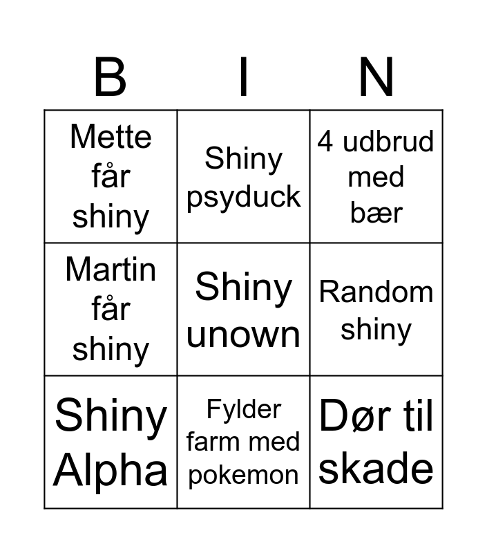 This bingo card has a free space and 8 words: Random shiny, 4 udbrud med bær, Shiny psyduck, Shiny Alpha, Mette får shiny, Dør til skade, Martin får shiny and Fylder farm med pokemon.